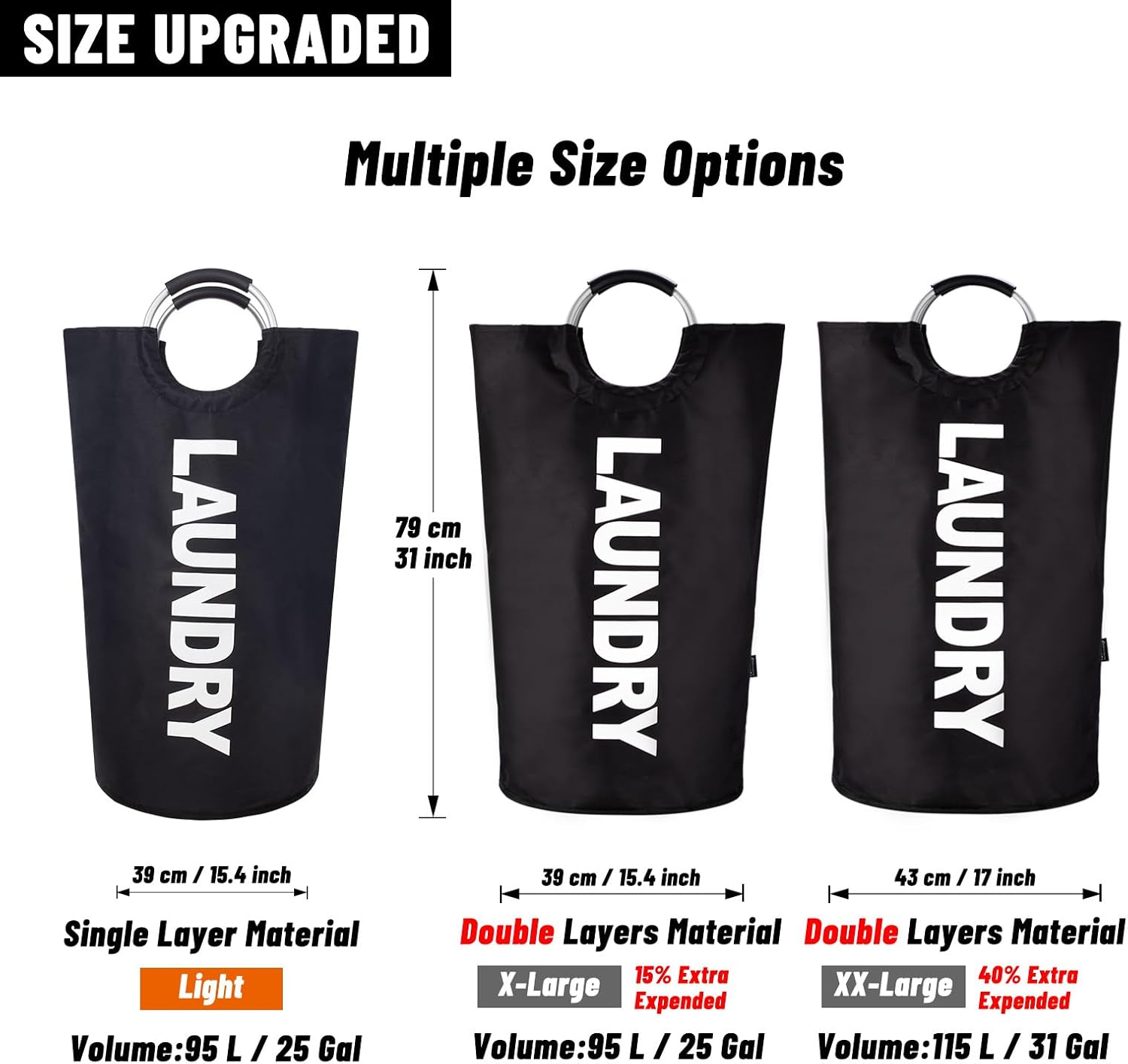 【Upgraded X-Large Capacity】Large laundry basket measured 15.4″ x 31″(39 x 79cm) offers spacious space to hold your clothes, linens, and towels. Clothes hampers for laundry with tall shape makes full use of vertical and corner space for space saving storage.
